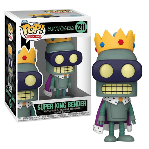 Adorned in a crown and cloak, POP! Super King Bender is here to join your POP! Animation collection! Assemble your Planet Express delivery crew by adding this robot to your Futurama lineup today.